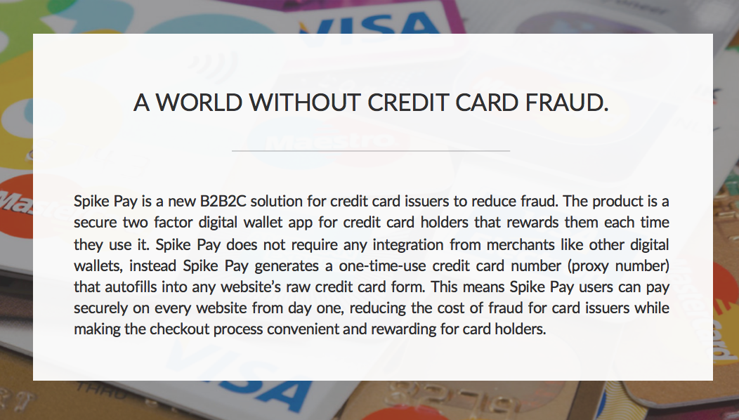 Our team founded Spike because we were fed up with how broken eCommerce 'secure' check-out is (users either have sign-up for multiple digital wallets as each wallet is only available on a select number of sites, or pay with their raw credit card numbers). Fraud costs over $19 Billion each year because many end up doing the latter, using 'insecure' card numbers. Spike Pay is the worlds first secure digital wallet (we tokenize card numbers and require 2-factor authentication) that is accepted on every website from day one. Spike Pay also rewards credit card points to users who checkout with it, incentivizing them to pay securely every time, which reduces fraud costs considerably for card issuers and payment networks.
