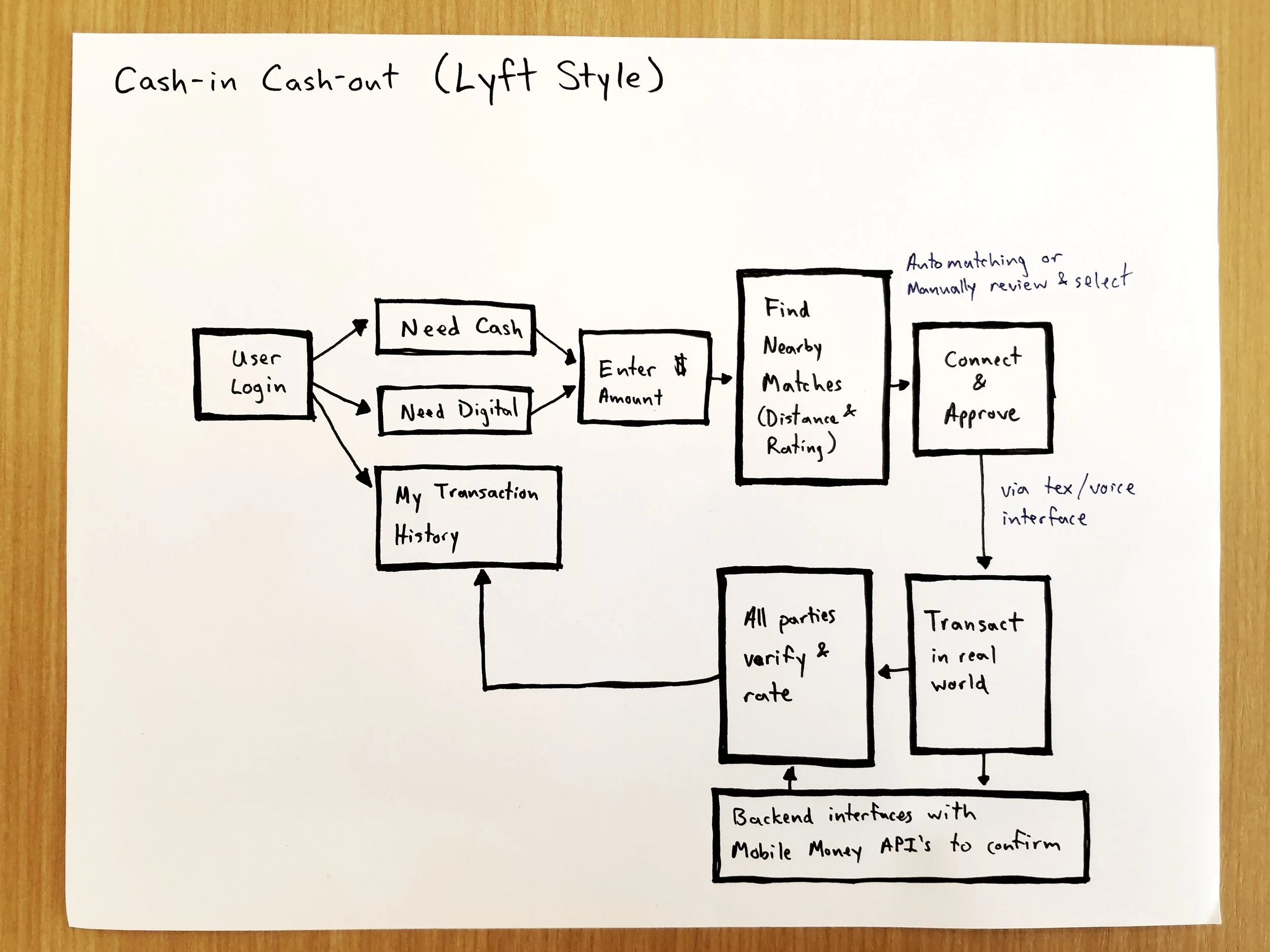 Four other students and I partnered with the Bill and Melinda Gates Foundation to build a tech solution for low-income people in rural India. Our goal was to create an easy, affordable and trusted way for these people to transform money from physical to digital and back, enabling them to become part of the digital economy. Our solution took the form of a chat-bot to pair users who needed physical cash with users who had physical cash (like the Lyft for Human ATMs). Our solution was built to work with the existing mobile money offerings, and meant to serve the "last mile," growing financial inclusion in rural India where traditional banking infrastrucure is unavailbable.
